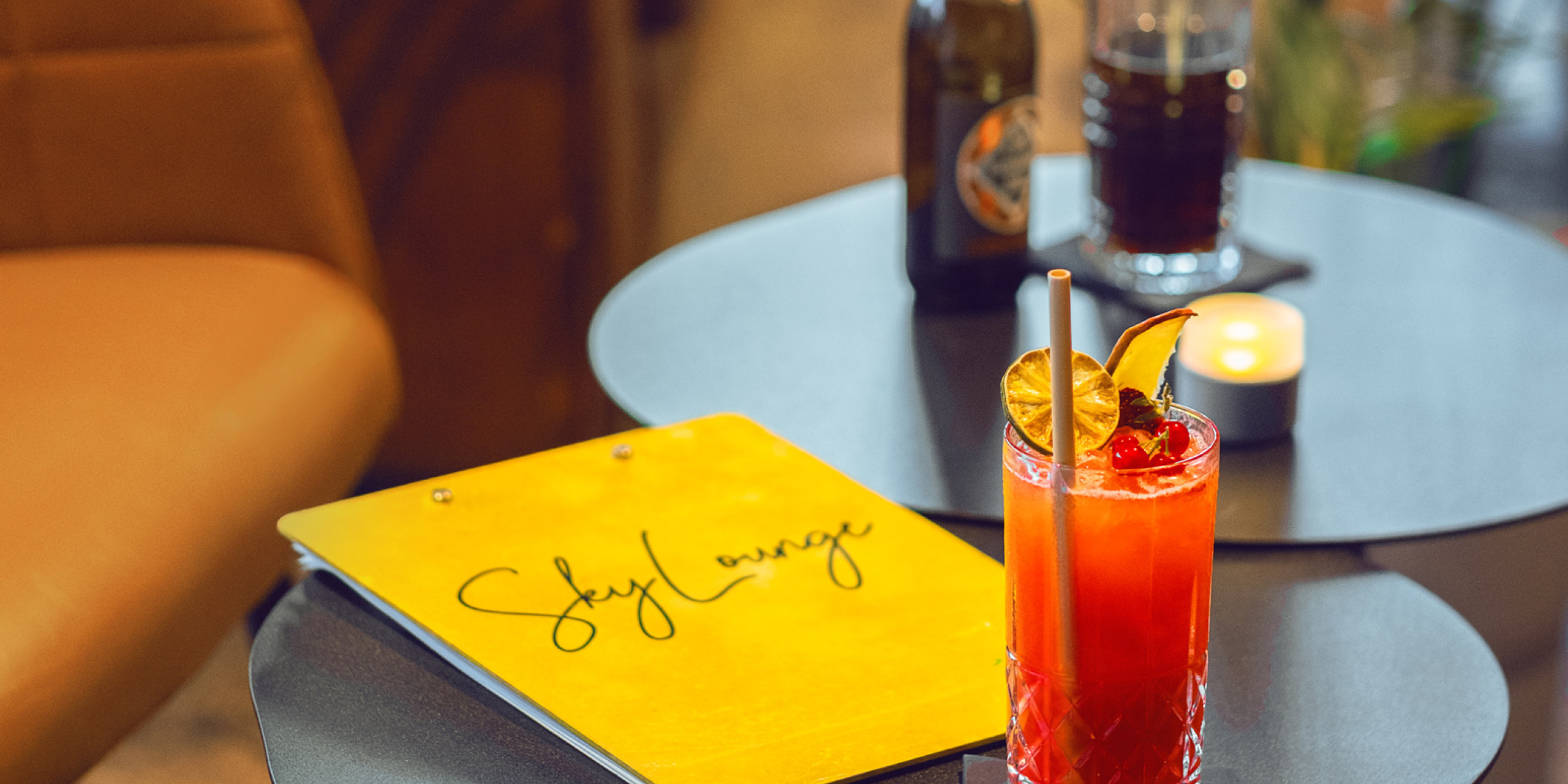 Ein stilvoller Tisch mit einem bunten Cocktail, einer Getränkekarte in Gelb mit der Aufschrift "Sky Lounge", einem Glas Cola und einer Kerze, umgeben von Pflanzen und einem gemütlichen Ambiente.